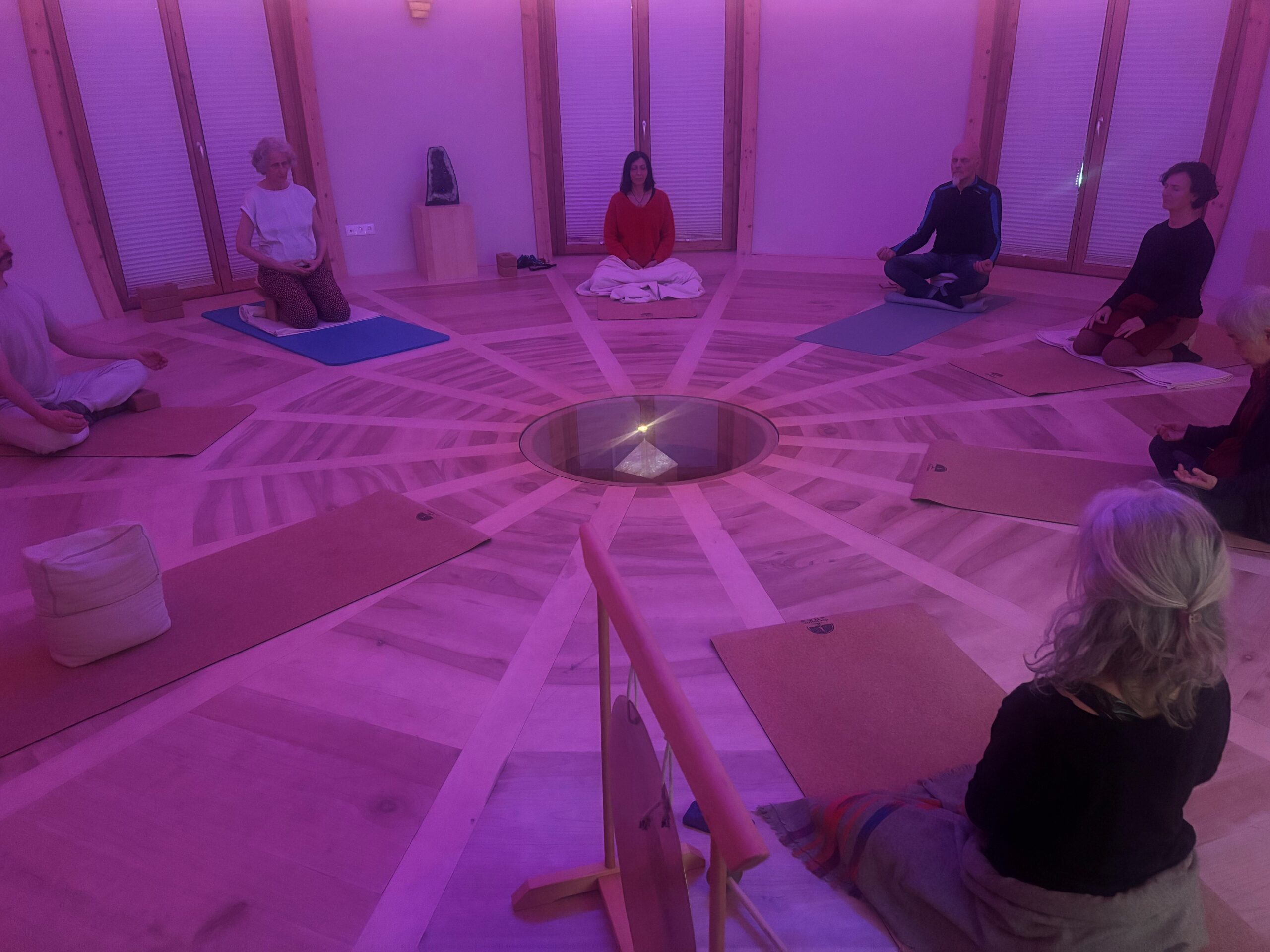 ca 1 Stunde einfaches Yoga, im Anschluss sitzen wir 2x 20 Minuten in Stille