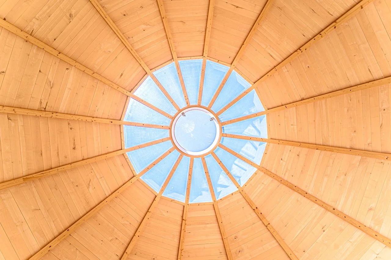 Ausgewählte Hölzer machen den etwa 12 m² großen kuppelförmigen Hauptraum zu einer heilenden Oase. Darum bieten wir den Dom sowohl als Apartment als auch als Seminarraum an.